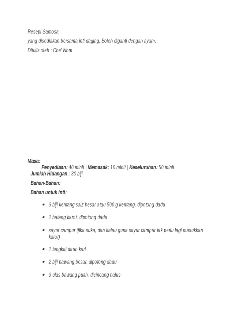 Resep-resep ini sudah banyak. Kalau buat besar-besar nanti rangupnya tak sesedap kerangupan samosa yang kecil. 250 gr terigu 1 sdm.